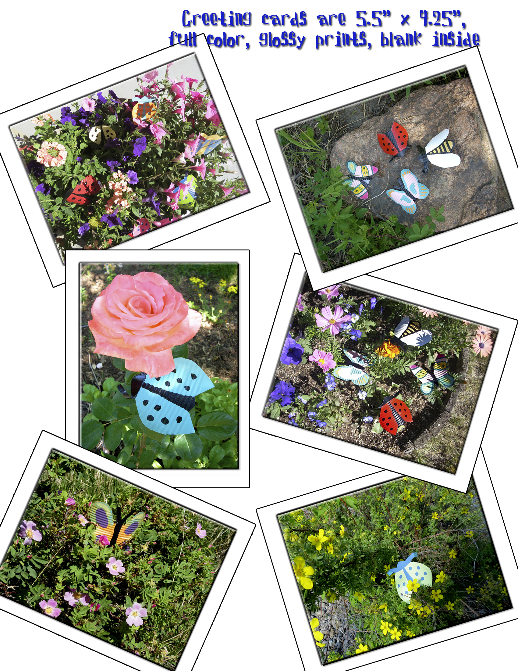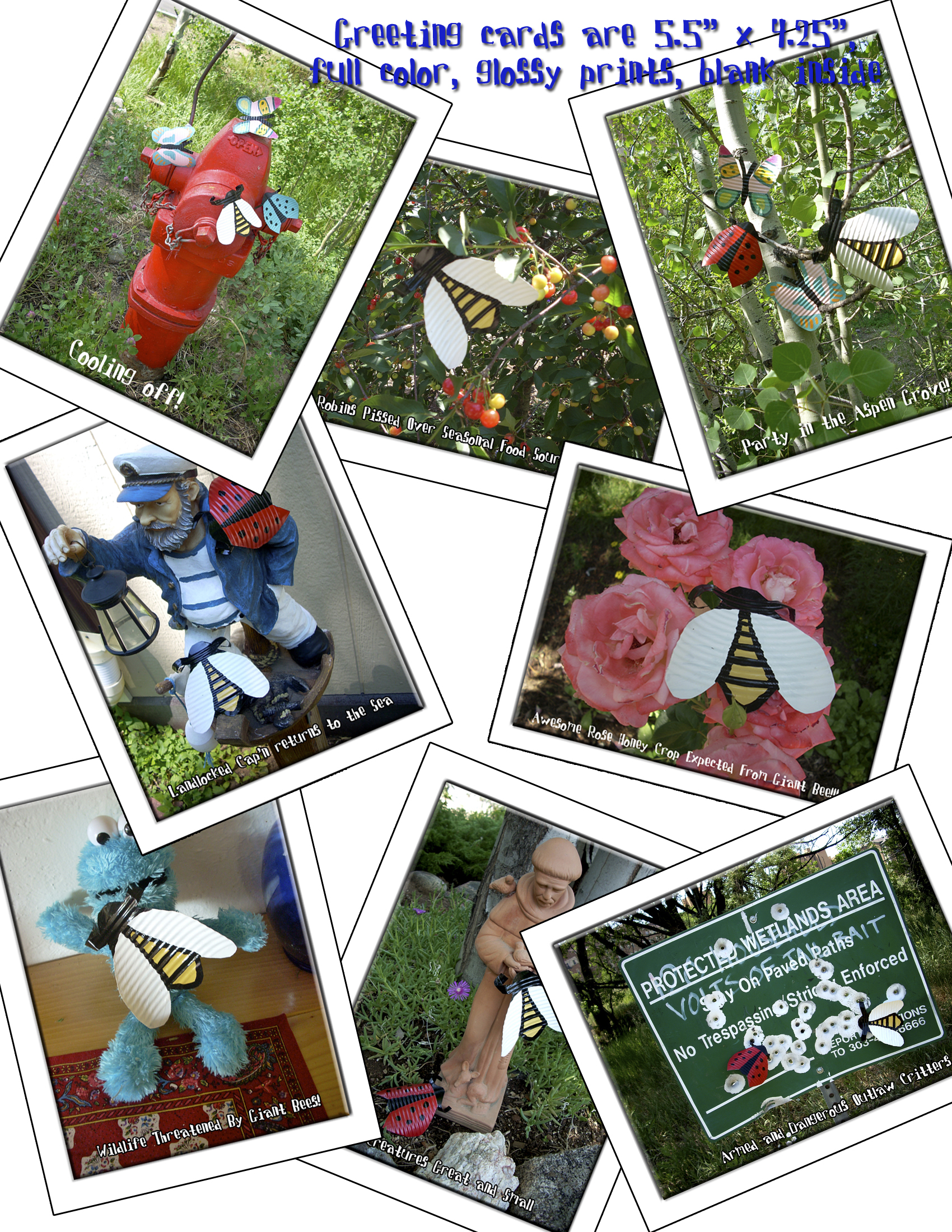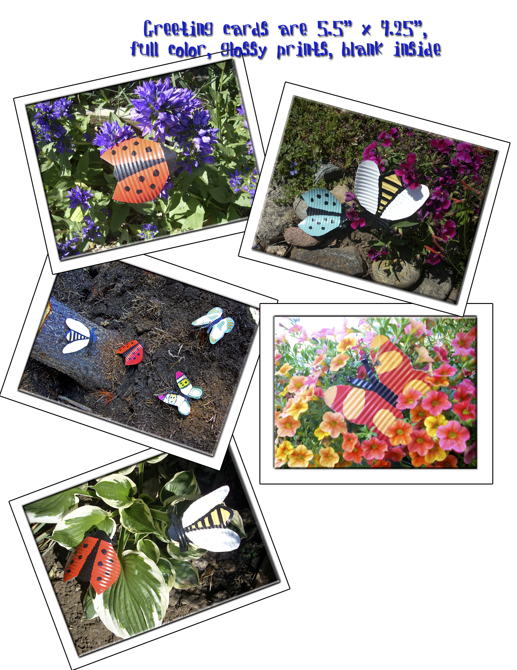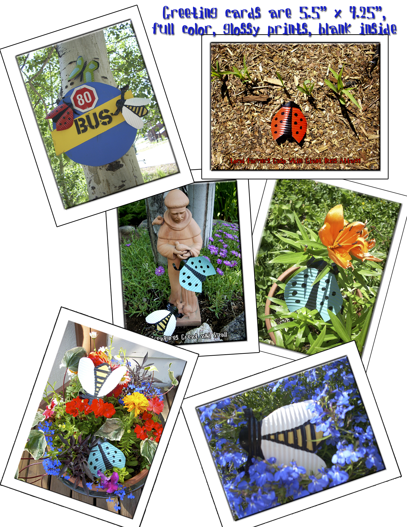 My fun sister took some of my “Tin Lizzie” insects, posed them, took pictures of them and I made greeting cards from the photos! I sell them for $1.50 for 2 cards.